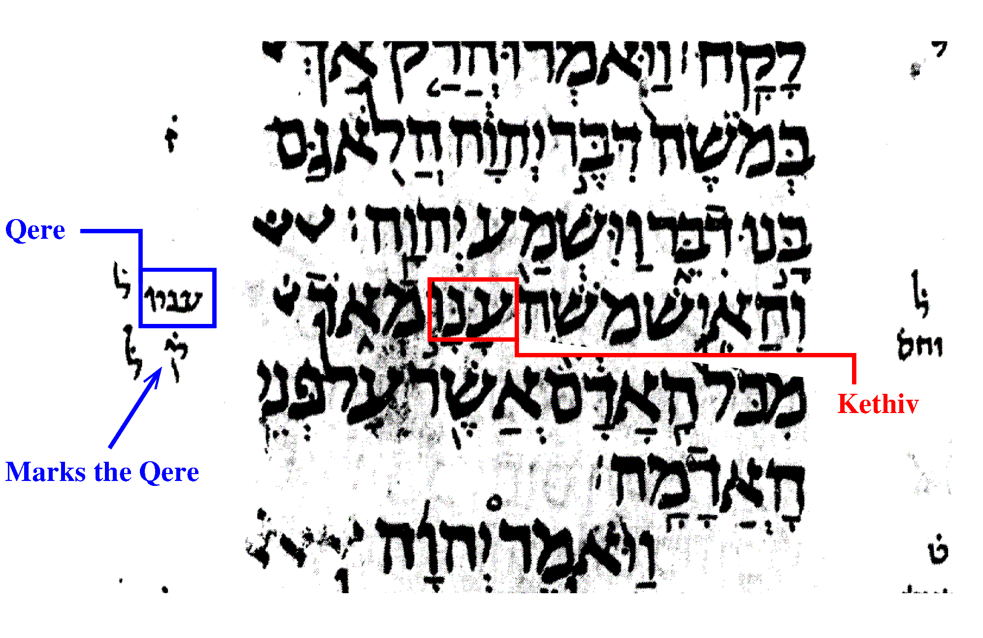 Several hundred of years after the completion of the New Testament, a system of vowel marks, accents, and margin notes began to be added to the new copies of the Old Testament text. This system was meant to aid the reading and interpretation of the Scripture and was created by Jewish scholars known as Masorets. Since this system is not part of the Scripture, it was written with small characters, while the Scripture text was written with large characters. Occasionally, the notes ask the reader to use a different word in the place of a written word. In such instances, the written word is called Kethiv (כתיב "what is written") and the replacement is called Qere (קרי "what is to be read"). Qere notes appear typically in passages in which the written text may seem difficult to interpret. The figure shows an example of a Qere note from the text of Nu 12:3 in the St. Petersburg Codex.